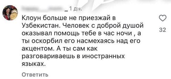 Первым масштабную реакцию в соцсетях сформировал ректор Университета журналистики и массовых коммуникаций Шерзодхон Кудратходжа. Его эмоциональный и резкий текст стал вирусным. В нем он заявил, что актёр якобы поставил себя «выше» местных жителей, перепутав уважение «с декорацией» и продемонстрировав отношение, «которое российская культура десятилетиями культивирует в анекдотах».