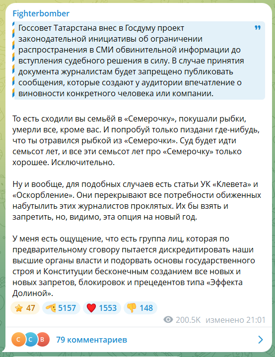 По сути, под действие данного законопроекта попадает практически всё: публикации о коррупции, расследования блогеров и журналистов, материалы о резонансных преступлениях. Даже теракты нельзя будет обсуждать, пока не будет вынесен приговор.
