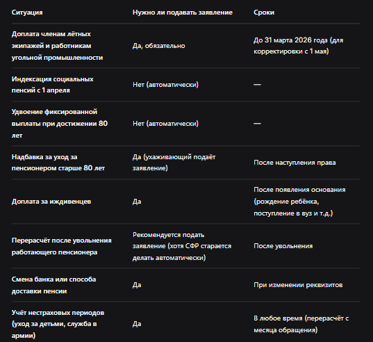Таблица: что требует заявления, а что происходит автоматически