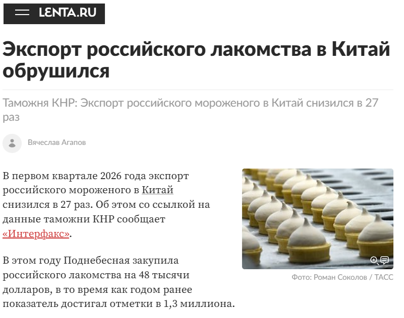 Особенно показательной стала динамика первого квартала 2026 года. Экспорт российского мороженого в Китай обрушился в 27 раз — сам товар наверняка у многих вызовет улыбку, но при этом он очень точно отражает масштаб происходящего. Если даже такой простой и массовый продукт теряет позиции на рынке, это сигнал куда более серьезных проблем. Речь идет уже не о частных неудачах, а о системной тенденции.