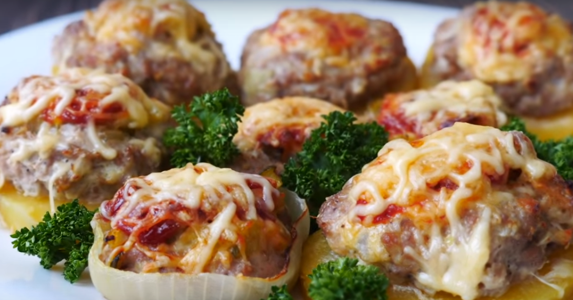 В кольца лука нужно выложить мясной фарш и сделать небольшие углубления в нем.