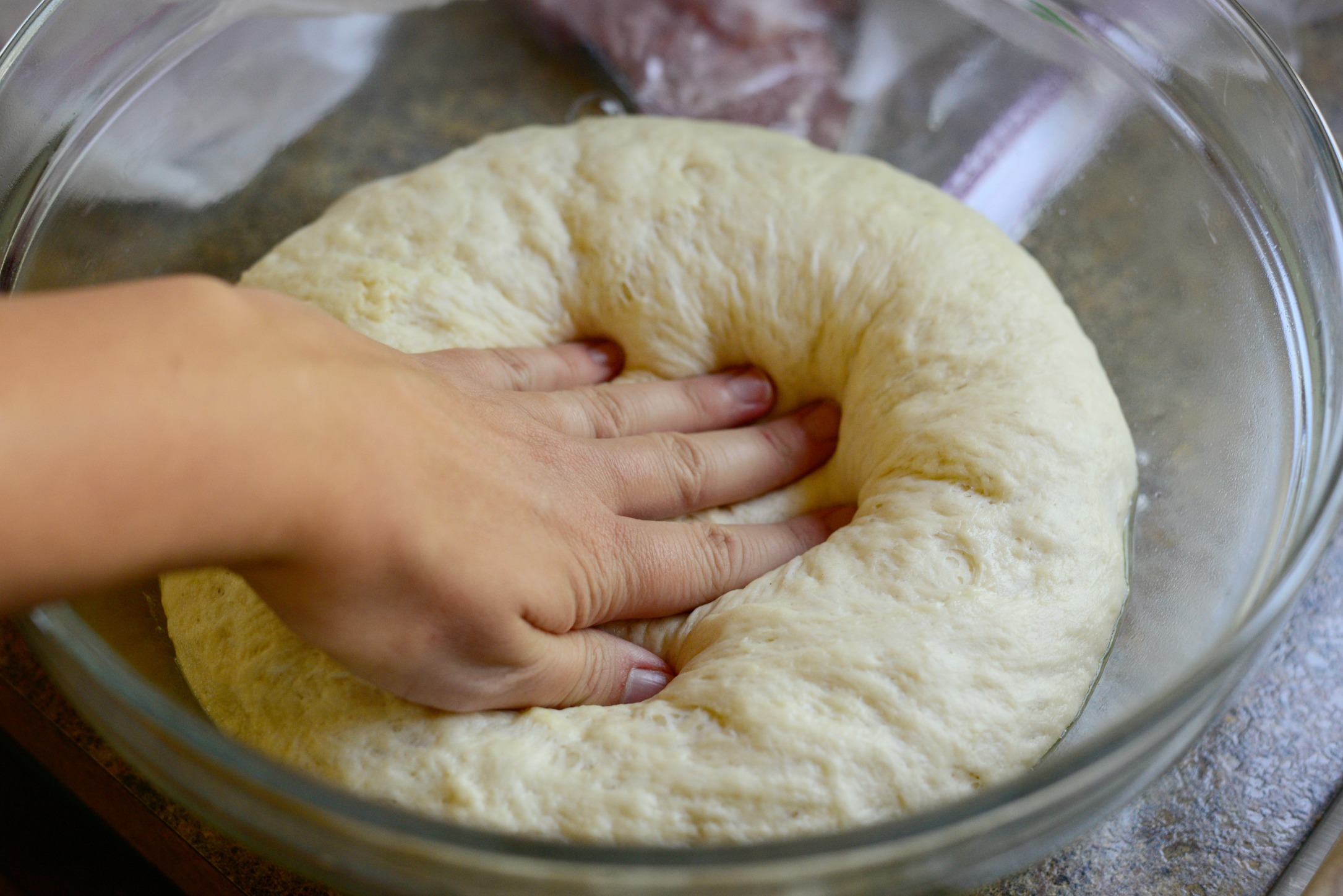 Как только тесто в миске собралось, перехожу на стол. Вымешиваю руками 5 минут. Тесто мягкое, месить его очень легко.