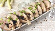 - Один из главных ингредиентов блюда – маринованный лук, его нужно подготовить заранее. За два часа до приготовления луковицы нарезают полукольцами, заливают водой и уксусом 1:1. На один противень блюда понадобится примерно 4 больших головки лука.
