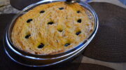 Противень застелить бумагой для выпечки, вылить тесто, распределить по противню.